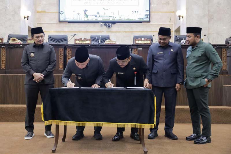 Ketua DPRD Kalsel H Supian HK bersama Gubernur Kalsel H Muhidin saat tandatangan pengesahan Perda Penyertaan Modal untuk Bank Kalsel. (foto : istimewa)