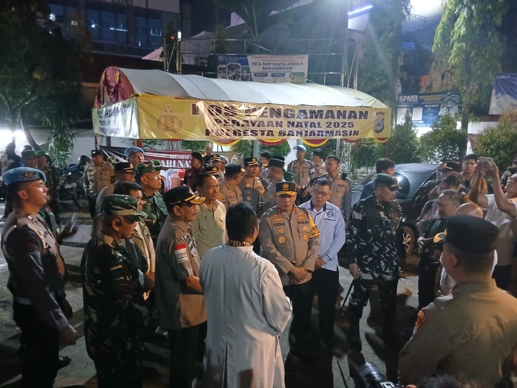 SEPUTARAN.ID, BANJARMASIN – Menyambut perayaan Natal bagi kaum Nasrani di Kalimantan Selatan (Kalsel), Forum Koordinasi Pimpinan Daerah (Forkopimda) Kalsel melakukan pemantauan langsung terhadap kesiapan pengamanan gereja dan kelancaran ibadah Natal 2025 di sejumlah titik gereja yang ada di Banjarmasin, Kalsel, Rabu (24/12/2025) malam.