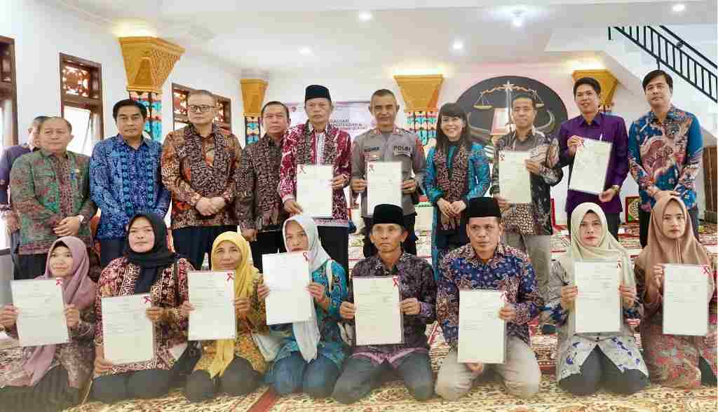 Warga foto bersama sambil menunjukan dokumen Hak Adat yang didaftarkan lewat Tanah Ulayat. (foto : Biro Humas ATR/BPN)