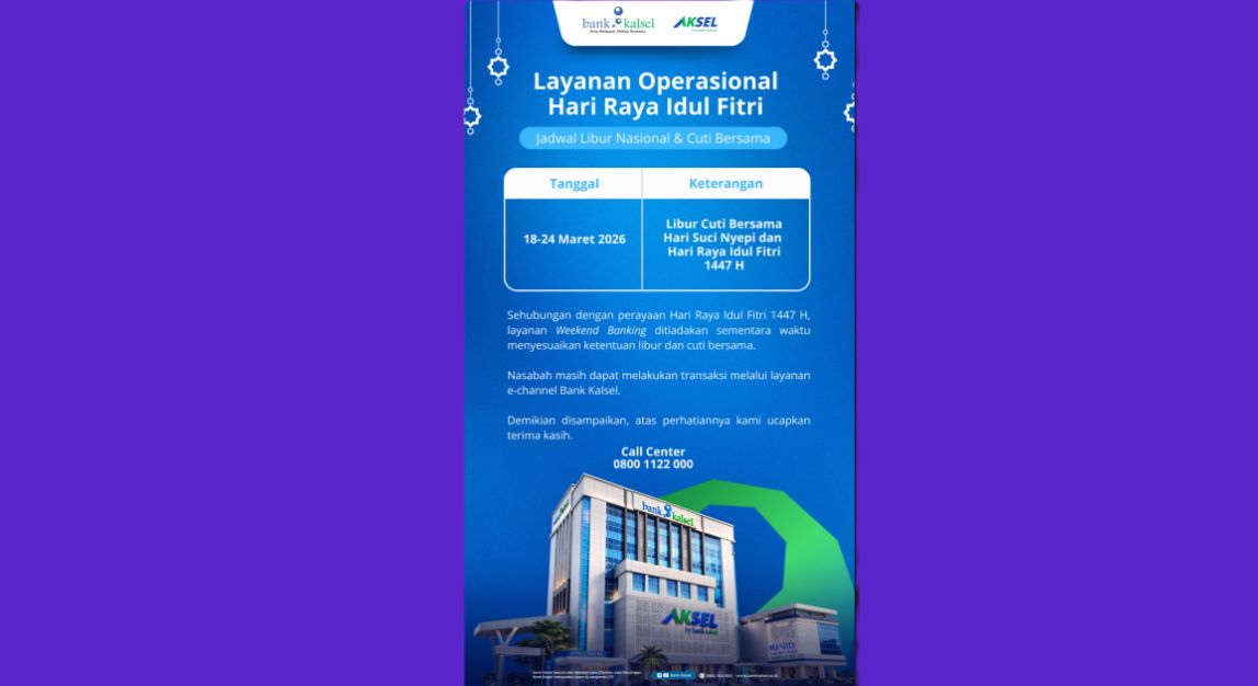 SEPUTARAN.ID, BANJARMASIN – Bank Kalsel mengumumkan penyesuaian layanan operasional perbankan sehubungan dengan libur nasional dan cuti bersama dalam rangka Hari Suci Nyepi Tahun Baru Saka serta Hari Raya Idul Fitri 1447 Hijriah.