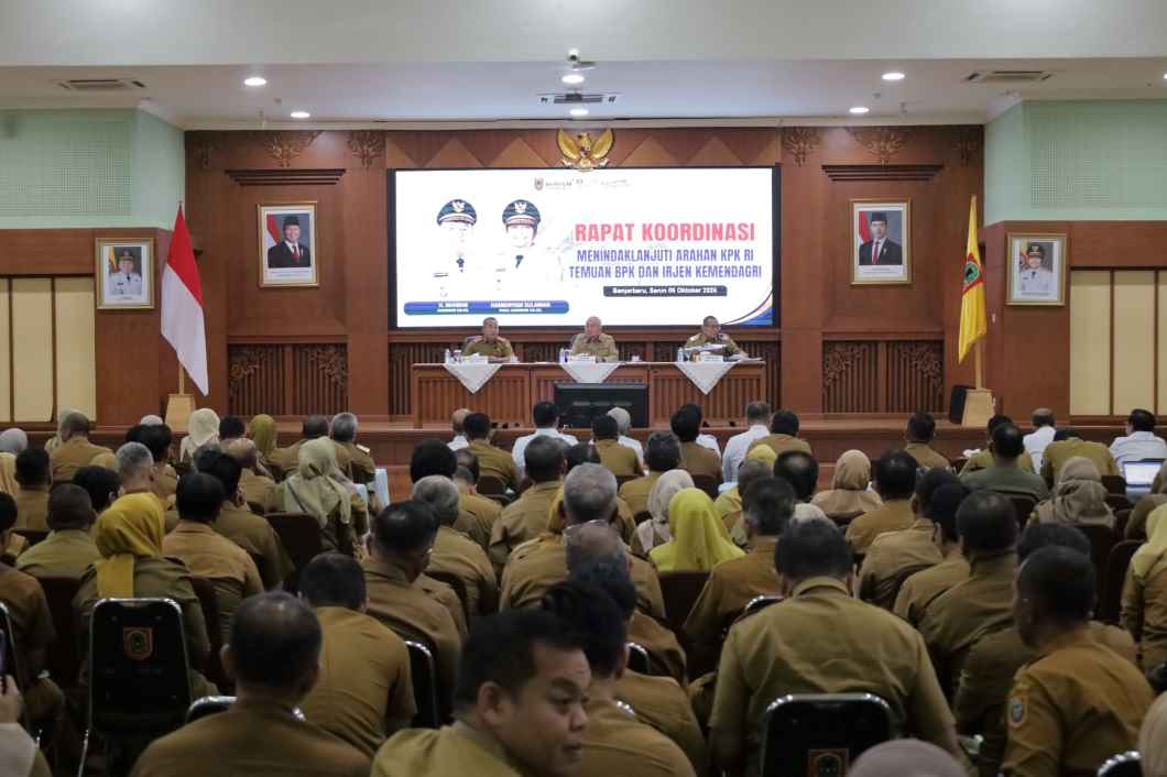 SEPUTARAN.ID, BANJARBARU – Gubernur Kalimantan Selatan (Kalsel) H Muhidin didampingi Sekretaris Daerah Provinsi Muhammad Syarifuddin, memimpin Rapat Koordinasi (Rakor) menindaklanjuti arahan Komisi Pemberantasan Korupsi (KPK) RI, temuan Badan Pemeriksa Keuangan (BPK) dan Inspektorat Jenderal Kementerian Dalam Negeri (Irjen Kemendagri), di aula KH Idham Chalid Kantor Gubernur di Banjarbaru, Senin (6/10/2025).