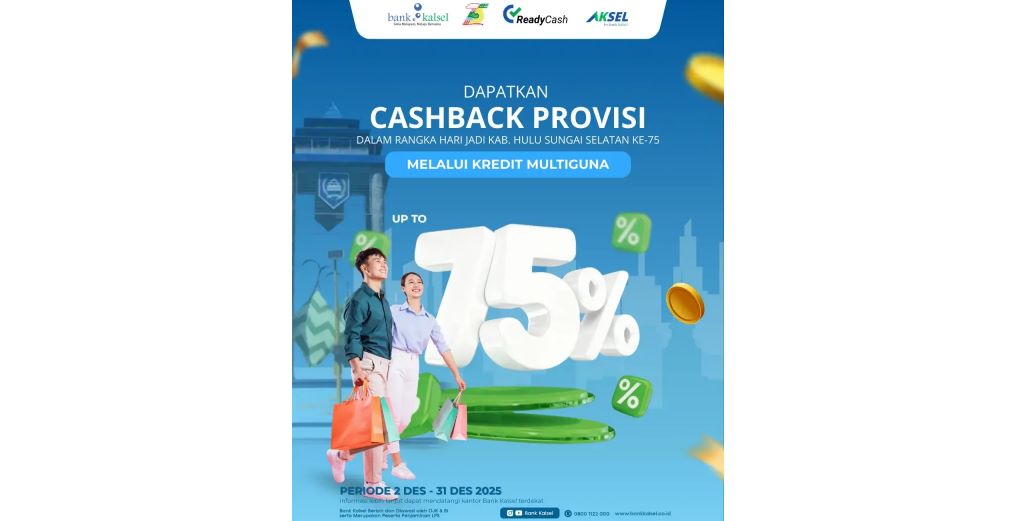 “Momentum hari jadi ke-75 HSS adalah waktu yang tepat bagi Bank Kalsel untuk memberikan manfaat yang lebih besar kepada masyarakat. Cashback Kredit Multiguna hingga 75 %, ini merupakan bentuk apresiasi kami kepada masyarakat yang telah mempercayai Bank Kalsel sebagai mitra layanan keuangan mereka,” ujar Fachrudin.