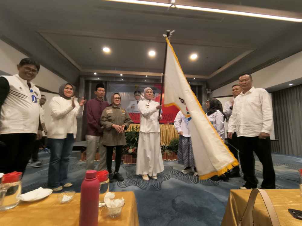 Ketua Kormi Banjarmasin terpilih Hj Ananda saat mengibarkan bendera Kormi. (foto : shn/seputaran)