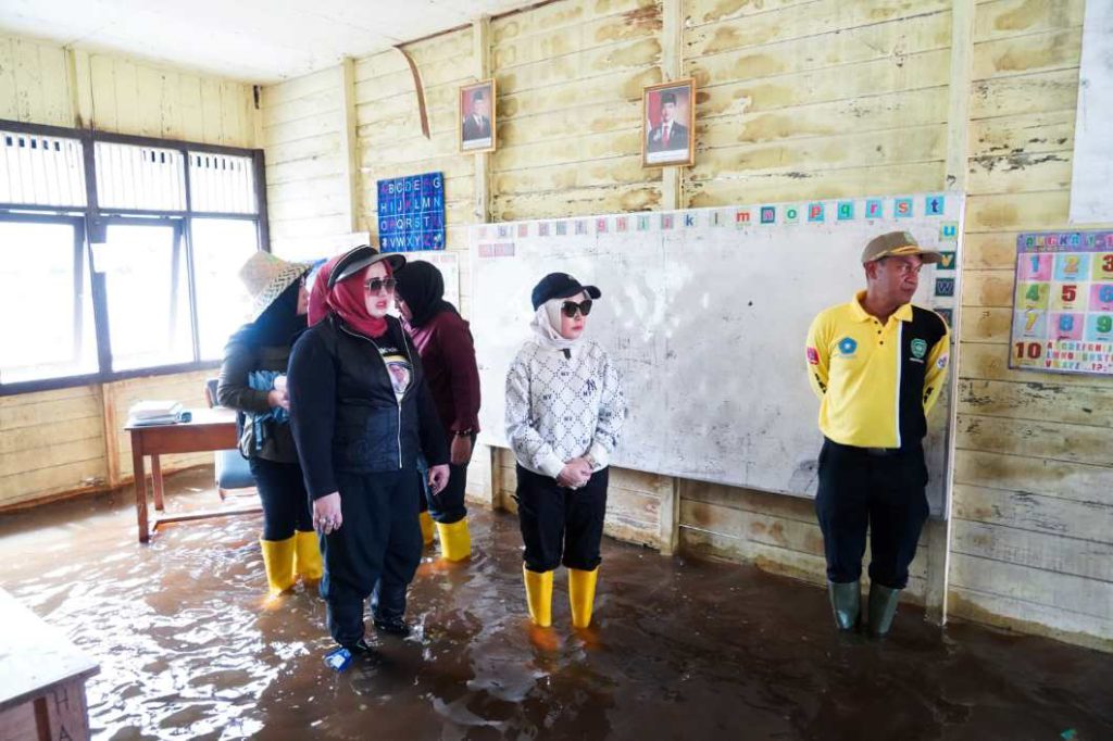 Didampingi pengurus TP PKK dan GOW Tapin, rombongan meninjau kondisi permukiman warga yang masih terendam. Selain menyapa dan berdialog langsung dengan warga, bantuan berupa kebutuhan pokok serta perlengkapan khusus perempuan juga diserahkan.