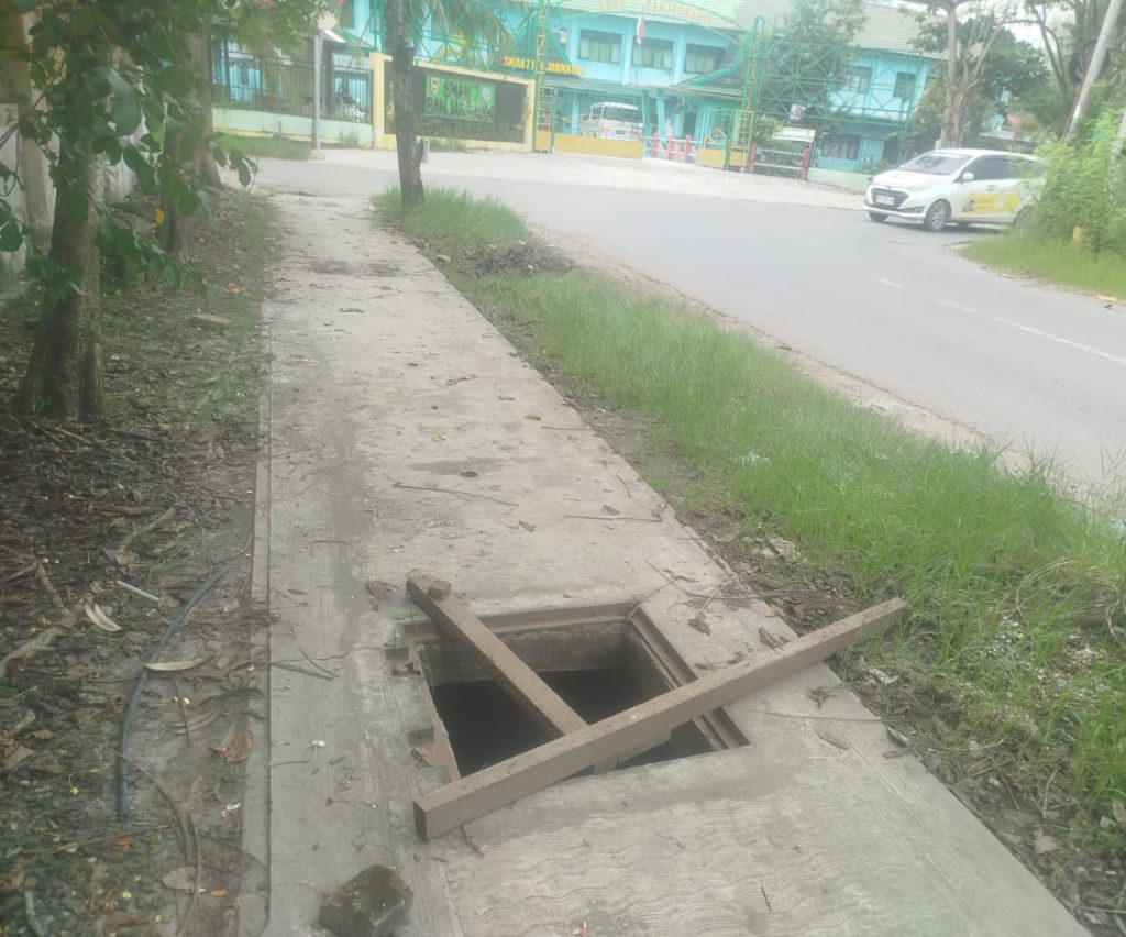 Sedikitnya ada beberapa titik lubang drainase yang dibiarkan terbuka tanpa pengaman memadai.