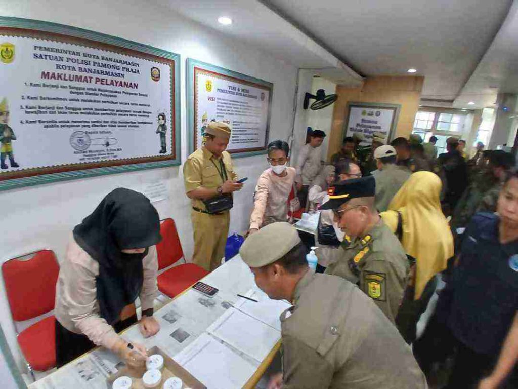 Para personel Satpol PP Banjarmasin saat menjalani pemeriksaan tes urine oleh BNNK Banjarmasin. (foto : shn/seputaran)